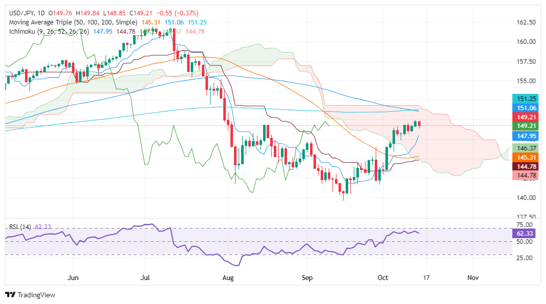 If USD/JPY falls below 149.00, the Tenkan-Sen at 147.95 emerges as the first line of defense for bulls. Once surpassed, the Senkou Span A at 146.48, followed by the 50-DMA at 145.36, would be the next key support levels.