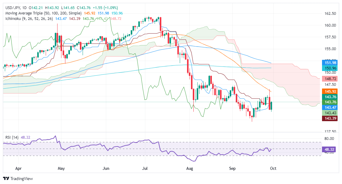The USD/JPY remains downward biased despite registering solid gains and climbing above the Tenkan-Sen and Kijun-Sen, each at 143.46 and 143.39, respectively. Nevertheless, price action remains below the 200-day moving average (DMA) and beneath the Ichimoku Cloud (Kumo), hinting that sellers are in charge.