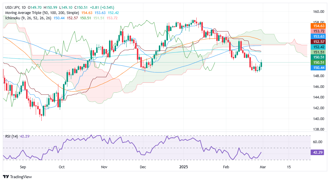 The USD/JPY pair's downtrend will remain in place unless buyers reclaim 150.93, the February 7 daily low that turned resistance. The Tenkan-sen at 150.44 was already reclaimed, but key resistance levels reaffirm the USD/JPY bearish scenario.
