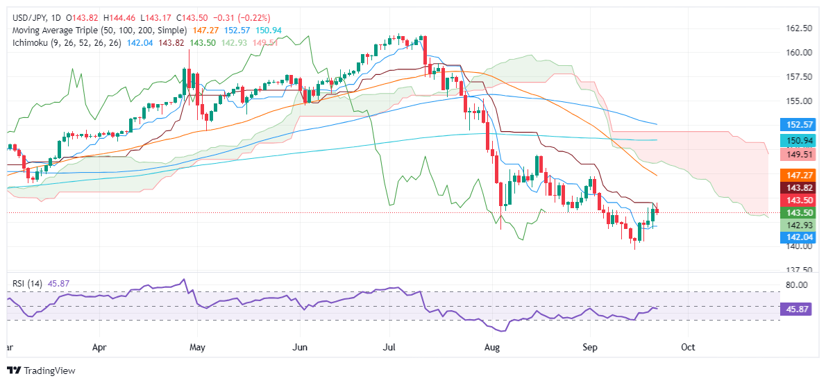 - USD/JPY falls to 143.45 after reaching a daily high of 144.46, pressured by softer US data fueling Fed rate cut speculation.