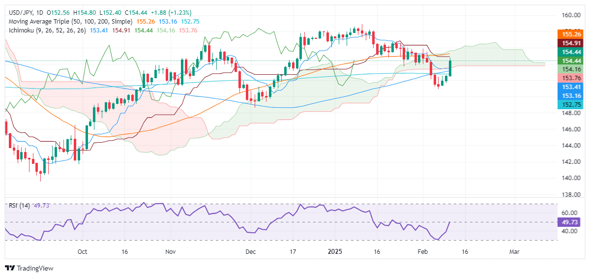 The USD/JPY enjoyed an over 1% rally on Wednesday after clearing the 200-day Simple Moving Average (SMA) at 152.76, opening the door for further upside. Despite this, the pair found stir resistance at the Kijun-sen at 154.90 before consolidating near the 154.50 area,