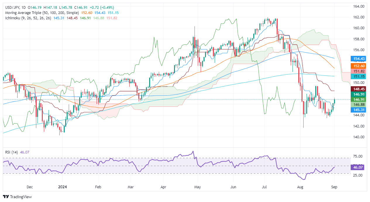 The USD/JPY rises for the fourth straight day on Monday as September commences, up by 0.49% amid thin liquidity conditions during the North American session. At the time of writing, the pair trades at 146.87 after bouncing off a daily low of 145.78.