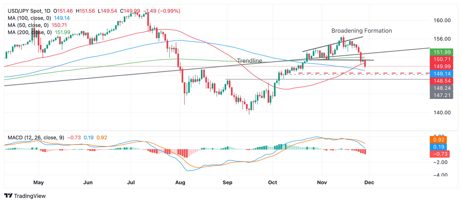 USD/JPY has breached the bottom of a bearish Broadening Formation price pattern and is falling toward the first downside target at 148.54, the 61.8% Fibonacci extrapolation of the height of the pattern extrapolated down.