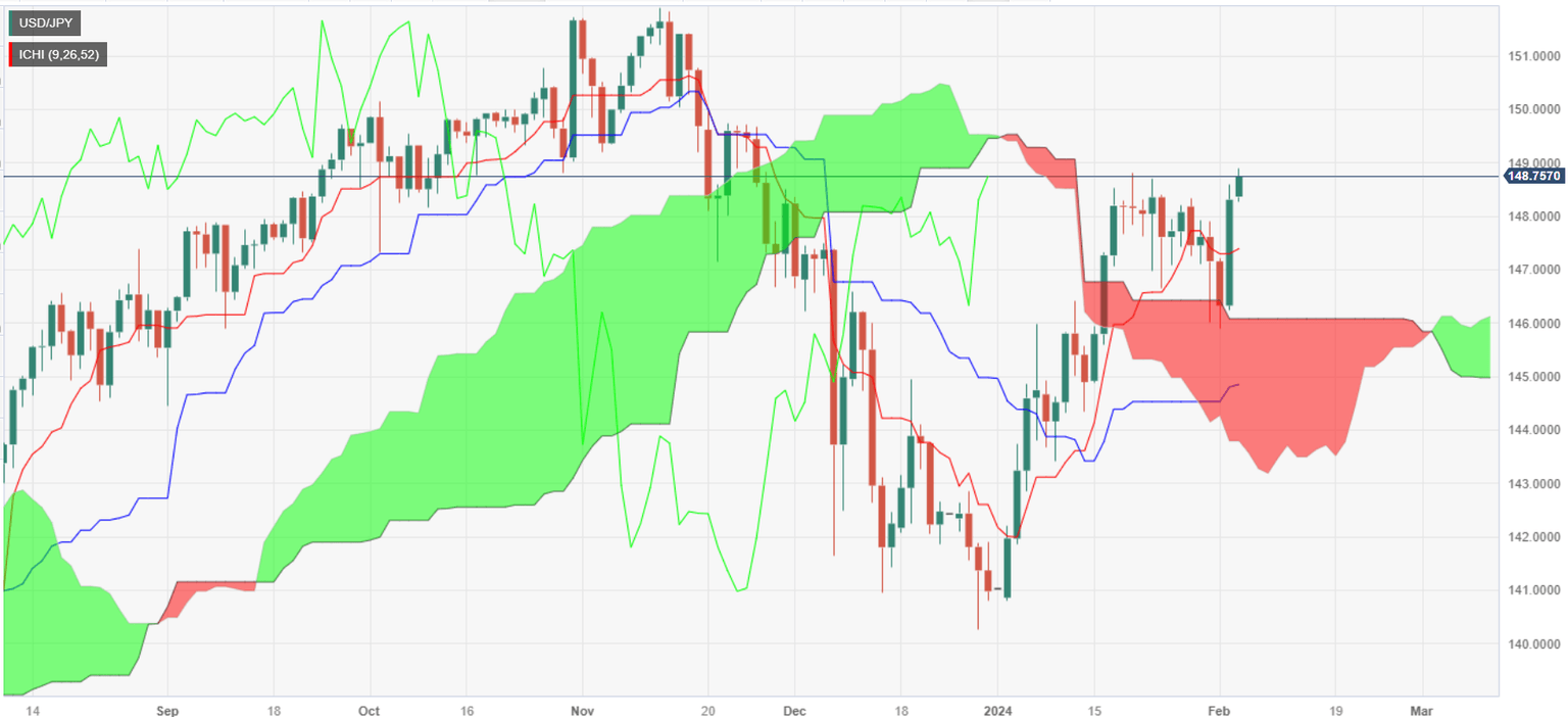 A bullish engulfing pattern formed above the crossover of the Senkou Span A and B, opened the door for further gains, but USD/JPY buyers need to reclaim 149.00, which could open the door to challenge the 150.00 figure. On the flip side, if sellers step in, they need to drag the exchange rate below 148.00 to test the Tenkan-Sen at 147.39.