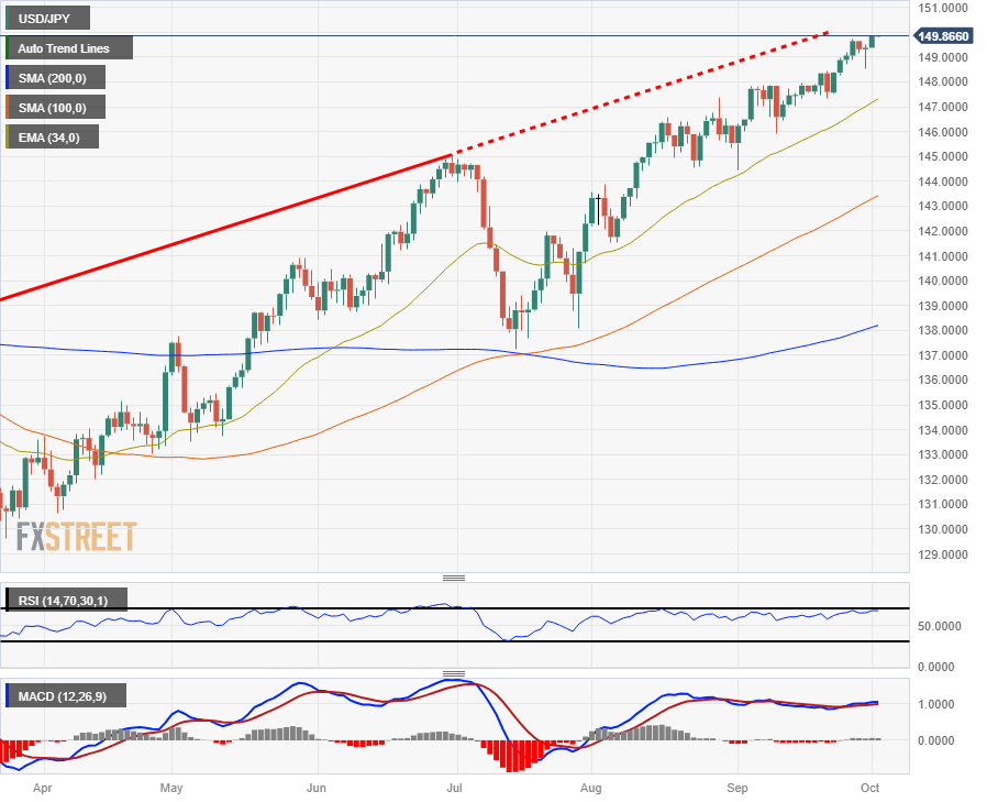 The USD/JPY is pinning into eleven-month highs just beneath the 150.00 major psychological handle, and Tuesday markets are rolling out of bed with the pair bidding near 149.85.