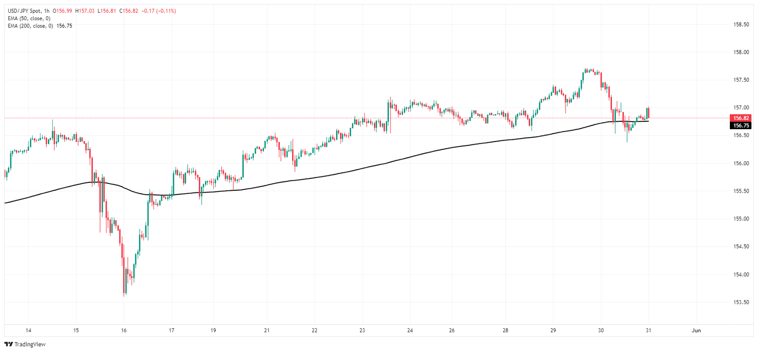 USD/JPY found a quick bump into the 157.00 handle early Friday, but the pair is receding back into familiar congestion near 156.80. The pair has been hamstrung along the 200-hour Exponential Moving Average (EMA) at 156.73 since falling back from this week’s peak near 157.70.