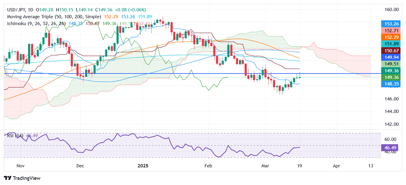 The USD/JPY pair climbs on Wednesday after the Federal Open Market Committee's (FOMC) decision to keep rates unchanged. Even though officials turned cautious on rates, the US Dollar (USD) failed to rally sharply. The pair hovers near 149.37, virtually unchanged.