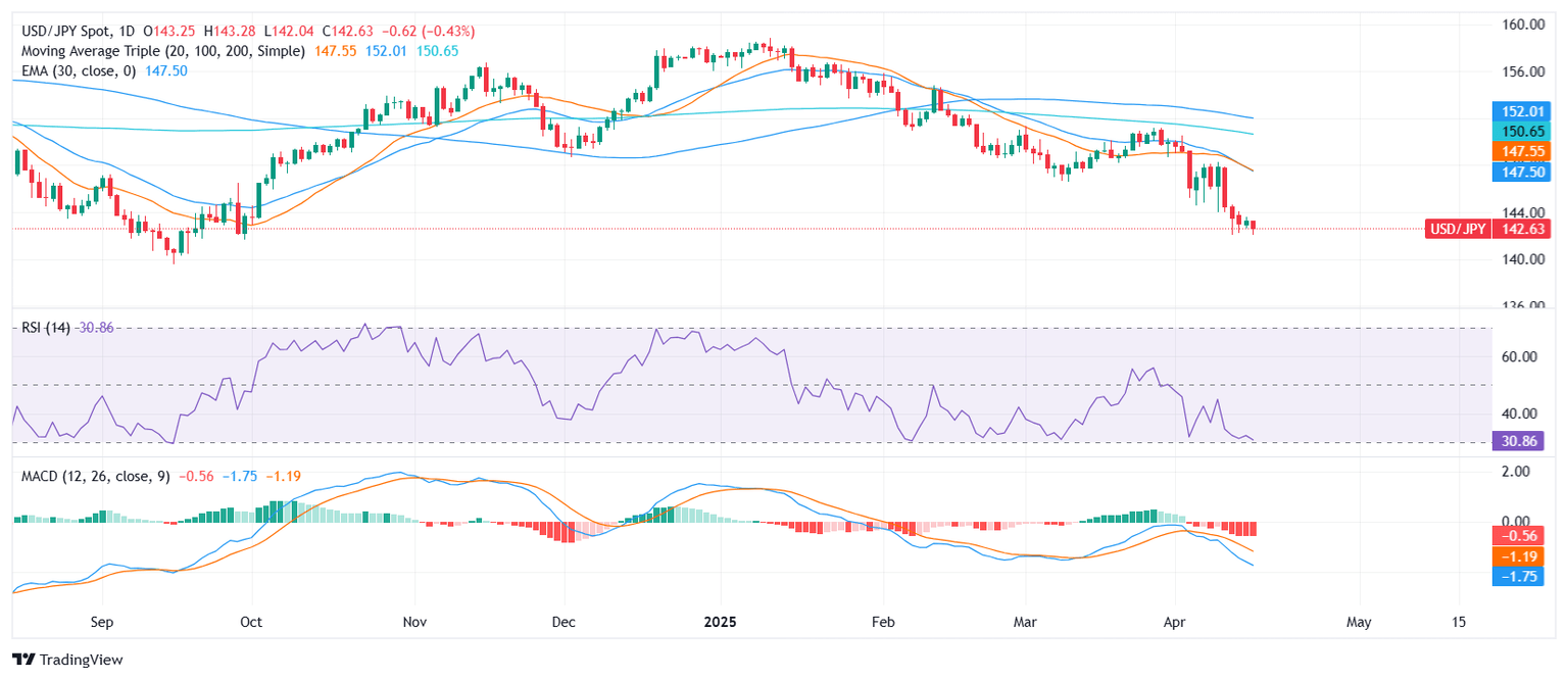 The USD/JPY pair holds a modest upside bias during Wednesday’s North American session, hovering around the 143 handle. Despite the intraday uptick, the broader tone remains cautious as the US Dollar stays under pressure in the face of escalating trade tensions and falling Treasury yields. The Japanese Yen, typically a safe haven during geopolitical flare-ups, has struggled to capitalize fully amid crosswinds in equity markets and monetary divergence.