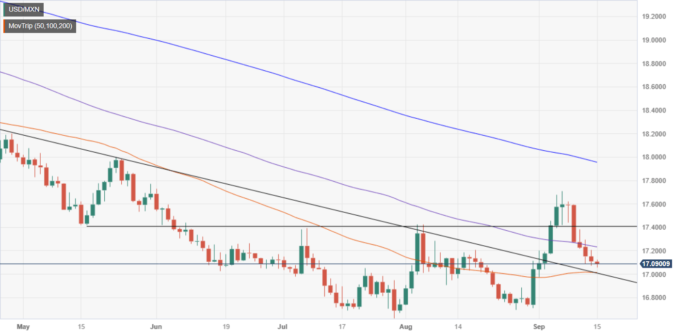 The Mexican Peso (MXN) extends its gains versus the US Dollar (USD), and prolongs its rally to five consecutive days, with USD/MXN bears setting their sight on the 17.0000 psychological level after sliding below the 20-day Moving Average (DMA) at 17.0921. The pair exchanges hands at 17.0741, down 0.19%.