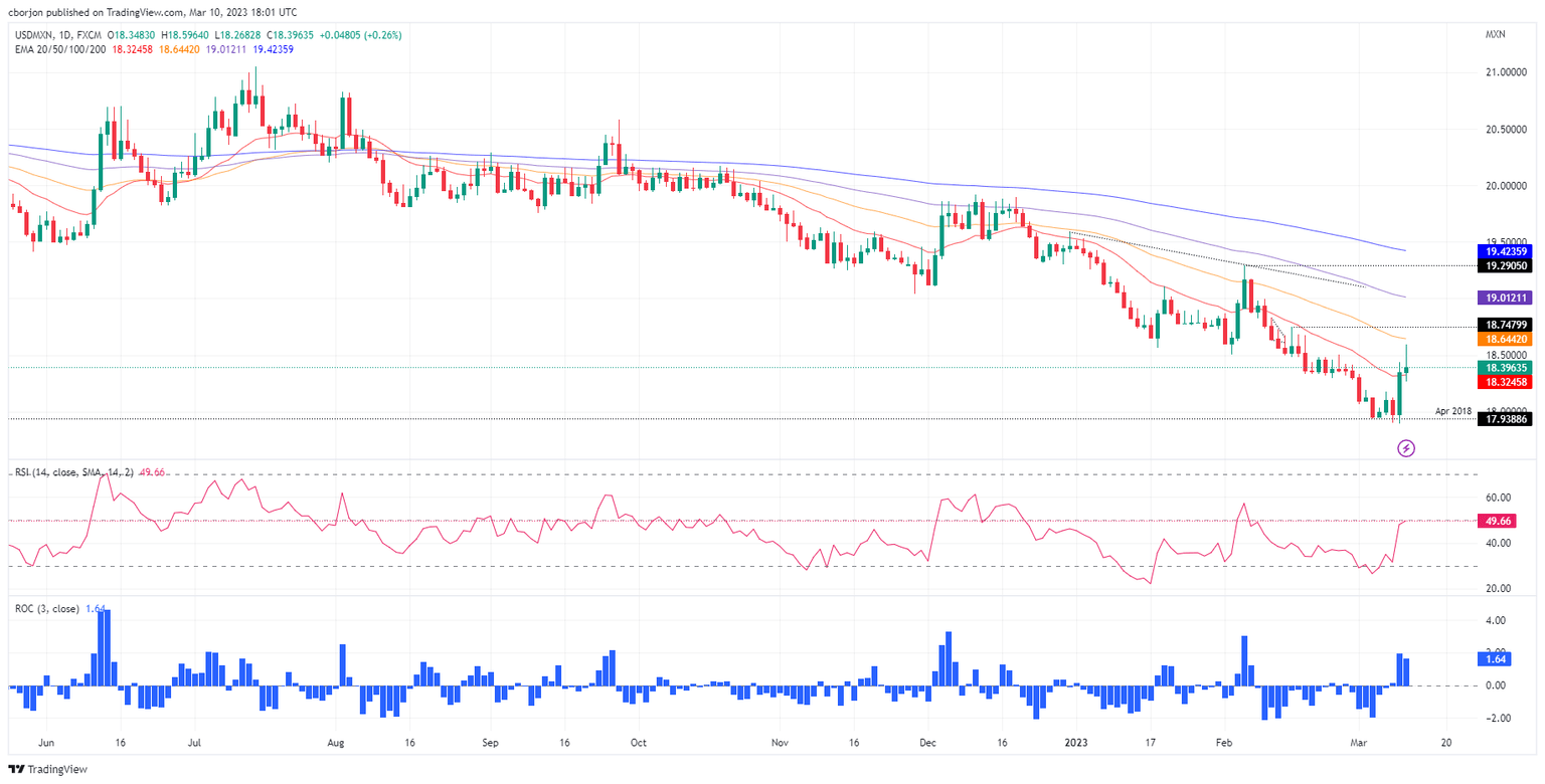 The USD/MXN has shifted neutral to downward biased after buyers reclaimed the 20-day EMA at 18.3247. The US jobs report assisted the Mexican Peso (MXN) and capped the rally that printed a weekly high at 18.5964, shy of the 50-da y EMA at 18.6442. As the New York session progresses, Friday’s candlestick turns to an inverted hammer, which could form an evening star pattern. A further downside in the USD/MXN is expected if that scenario plays out. For a bearish continuation, USD/MXN sellers need to reclaim $18.15. On the flip side, buyers keeping the USD/MXN exchange rate above the 20-day EMA would remain hopeful of testing the 50 and 100-day EMAs in the next week, around 18.644 and 19.0122.
