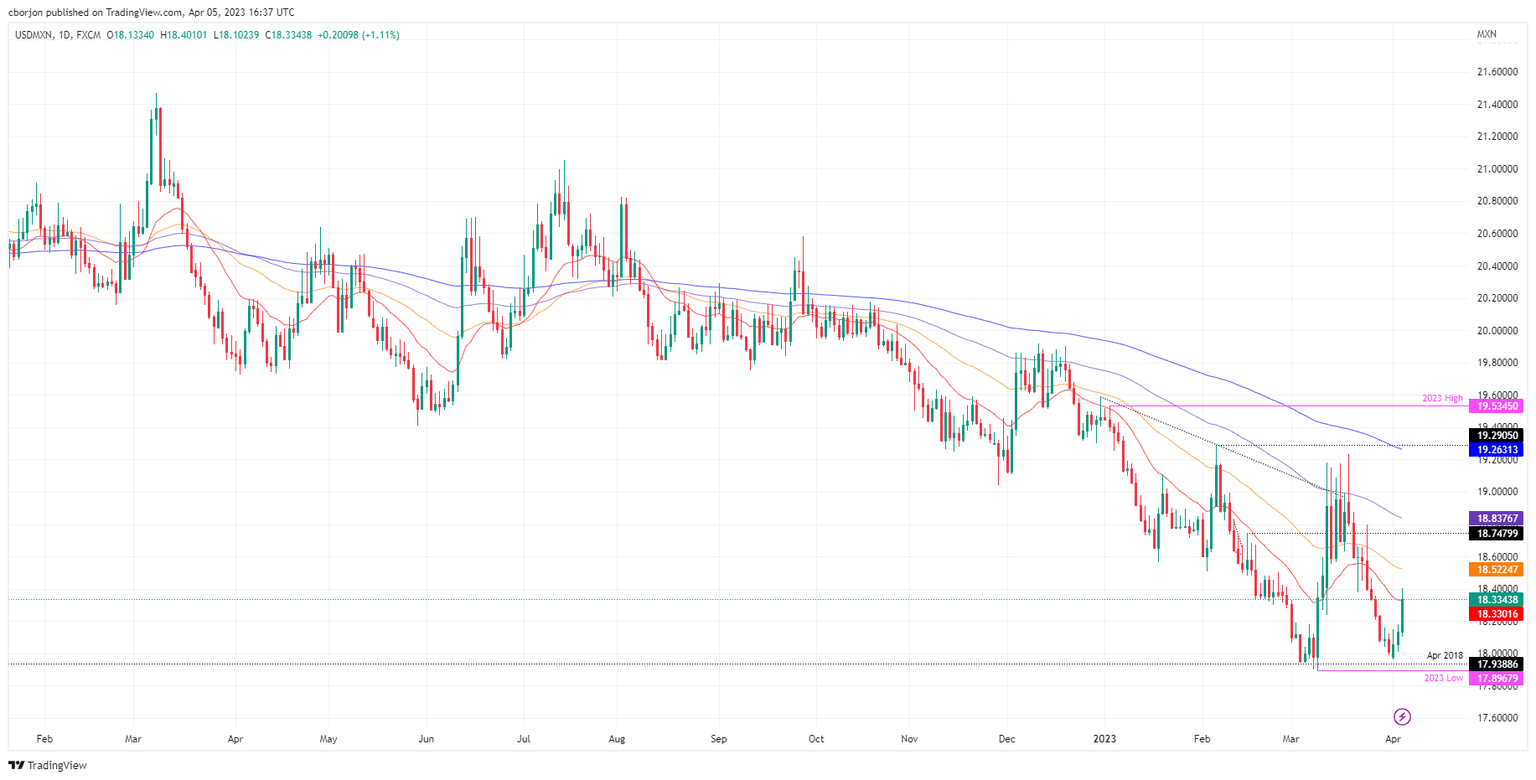 The USD/MXN appears to have bottomed at around 18.0000. USD/MXN weekly gains above 2% spurred a rise from 17.9644 toward 18.4000, exposing the 20-day Exponential Moving Average (EMA) at 18.3329. A daily close above the latter could exacerbate a rally towards the 100-day EMA At 18.8382, but firstly, buyers need to clear the 50-day EMA At 18.5235. On the other hand, a dip below the 20-day EMA and the USD/MXN could re-test 18.0000.