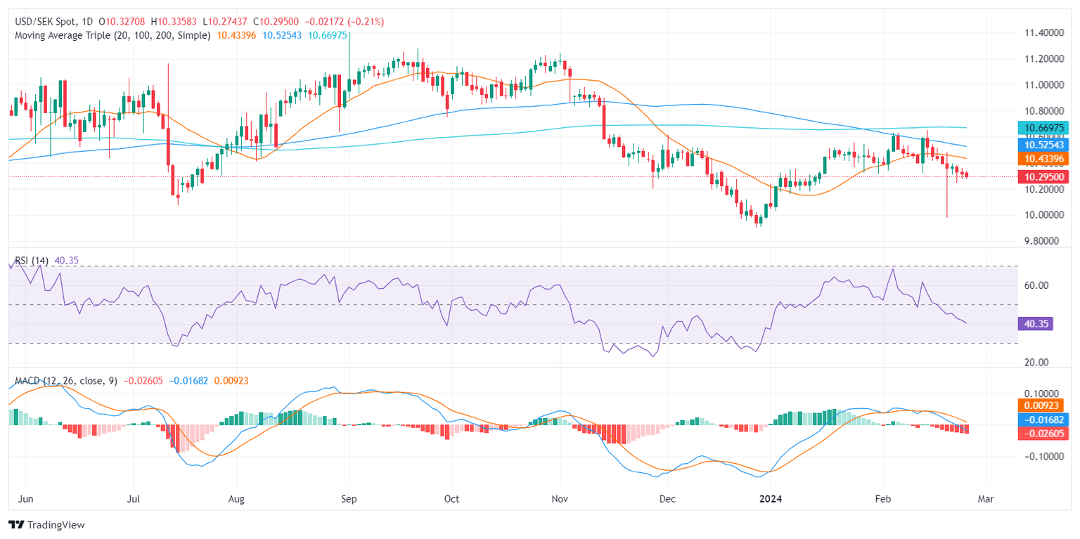 In case the Swedish monetary policy aligns with the American, the health of each economy will dictate the pace of the pair. For this week, the US will report revisions on the Gross Domestic Product (GDP) from Q4 and Personal Consumption Expenditures (PCE) figures from January, which may affect the expectations on the next decisions from the Fed and potentially fuelling volatility on the pair. As for now, the odds of a cut in March and May seem to have been disregarded by the markets and instead pushed to June.