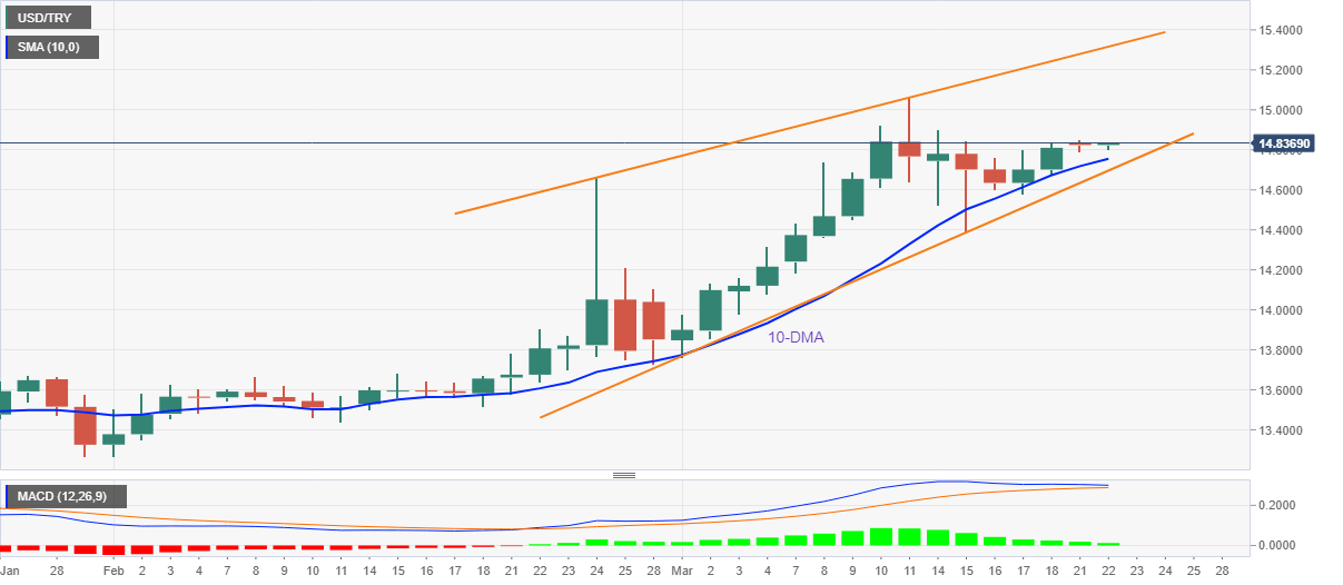 In doing so, the Turkish lira (TRY) pair extends the last week’s U-turn from the 10-DMA inside a one-month-old rising wedge bearish chart pattern. Also teasing USD/TRY sellers is the receding bullish bias of the MACD.