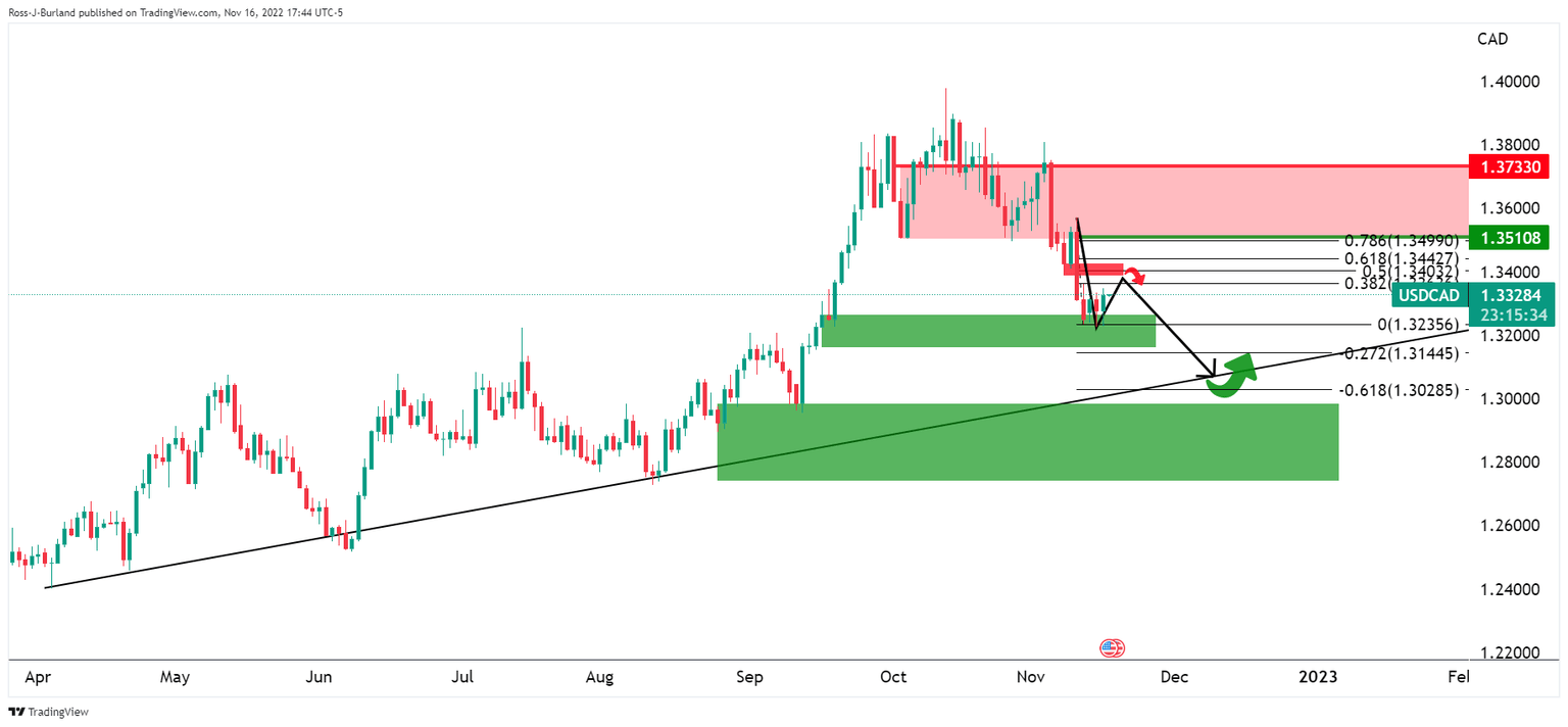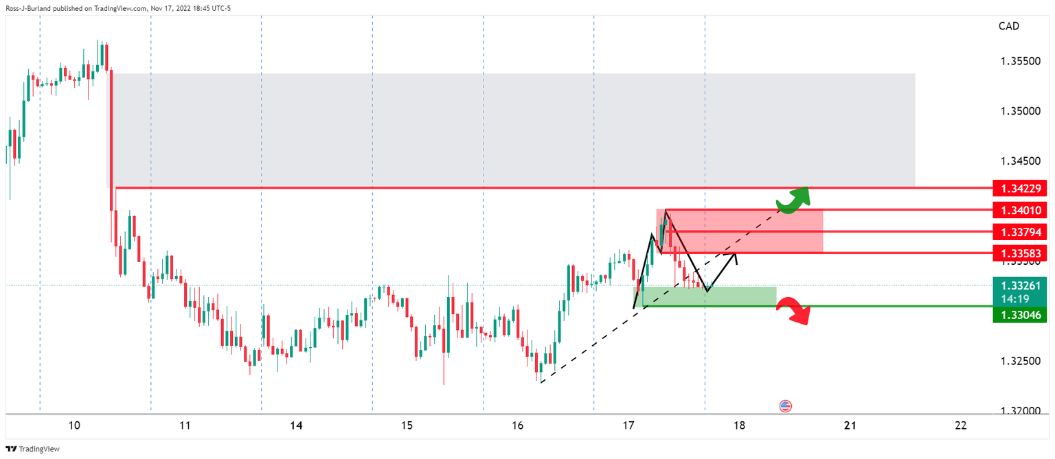 - USDCAD bulls remain in play but there are risks of a break below 1.3300.
