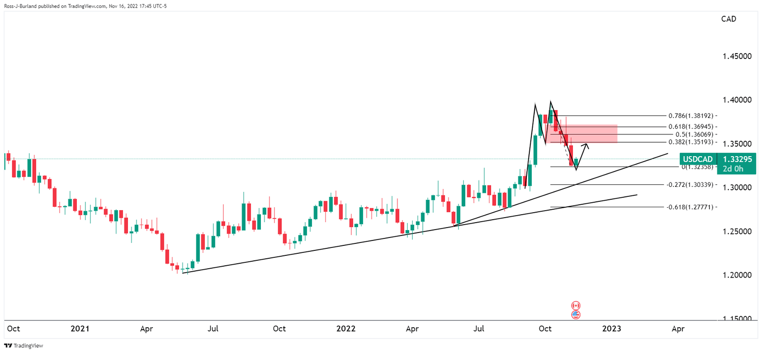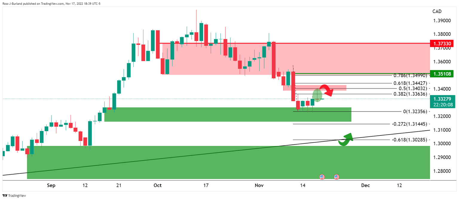 it was explained that the Bank of Canada next meets on December 7 and a 25 bp hike to 4.0% is expected and that there is a long time between now and then that gave rise to prospects of a meanwhile correction as follows: