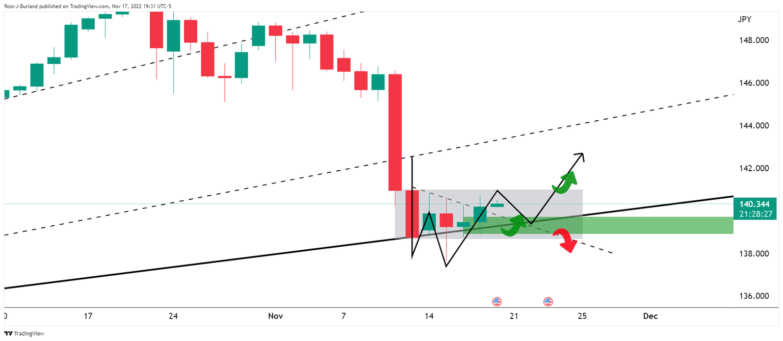 The US Dollar index DXY is however stabilizing after a small miss on US inflation last week that was negated by hawkish comments from some Federal Reserve officials arguing one report will not be the grounds for a pivot. The price is boxed in but a breakout could be on the cards immanently, one way or the other. The following illustrates a bullish bias so long as the trendline and horizontal support between 139.00/50 holds: