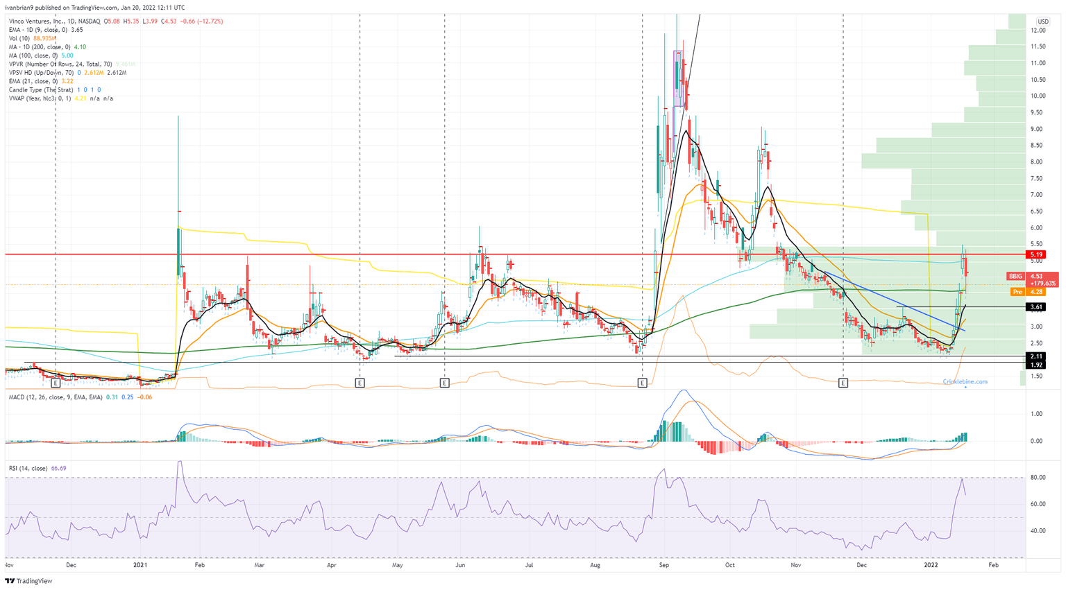 Vinco Ventures (BBIG) stock finally had a down day on Wednesday as momentum finally ebbed. This was not too surprising given the strong charge the stock has been on for most of this week and last too. BBIG shares put in five straight days of gains before yesterday and moved from $2.31 to $5.49 before yesterday's pullback. The question with these momentum plays is what to do when momentum stalls?