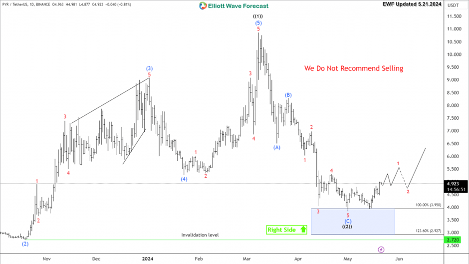 $PYR started its rally from November 2022 low similar to Bitcoin, the token moved +315% to the upside until March 2024. The advance unfolded within a regular 5 waves impulse in wave ((1)) therefore a correction in wave ((2)) was inevitable. $PYR saw a 64% decline in the recent two months to correct the entire rally. The 3 swing move to the downside is labeled as a ZigZag structure (A)(B)(C) and it reached its target area within the blue box at equal legs $3.95 – $2.92.