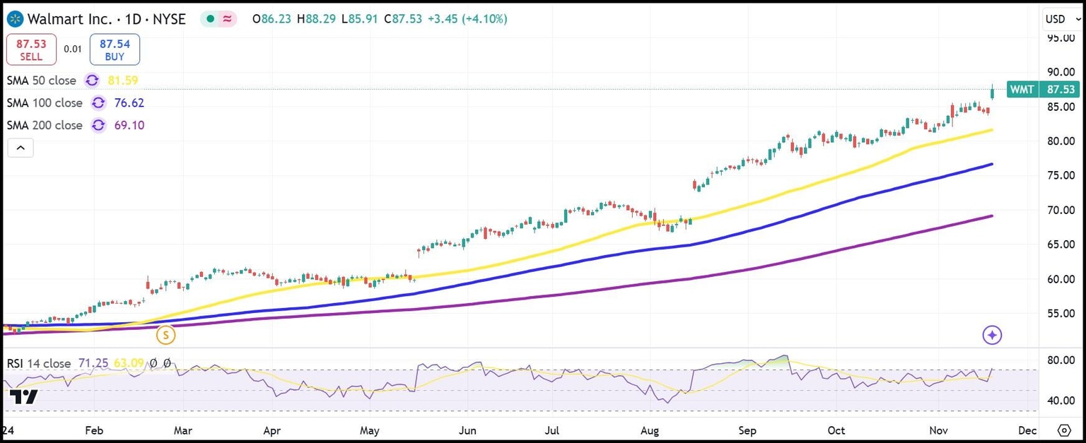 - WMT rose 3% on the day to close at $86.60 after raising full-year guidance.