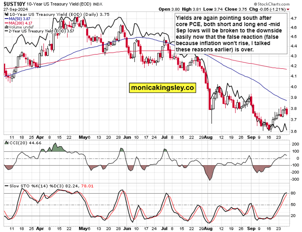 Not that gold and silver would just be plain rising – I‘ve been striking a cautious tone before core PCE, and this is how the setback then went. Crude oil is in an entirely different position unlike natural gas or uranium (hello XLU still doing great), but I‘ve talked black gold for many weeks in this context, my conclusions haven‘t changed much. Bitcoin and crypto names COIN, MARA and MSTR are still looking good, and reacting to the great macroeconomic easing.