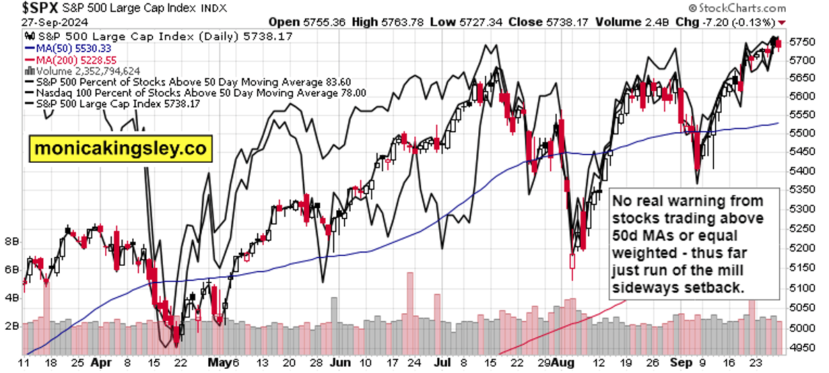 S&P 500 didn‘t quite reach Thursday‘s highs, and the 0.1% undershoot in core PCE aftermath was to blame. We caught it in Russell 2000 in the intraday channel as smallcaps benefited from bonds finally turning up. Communications had a good day too – Friday was simply about yields and continued piling into China names – the multifaceted, strong stimulus is making consumer discretionaries on the high end, materials, industrials, base metals beyond copper, and precious metals benefit.