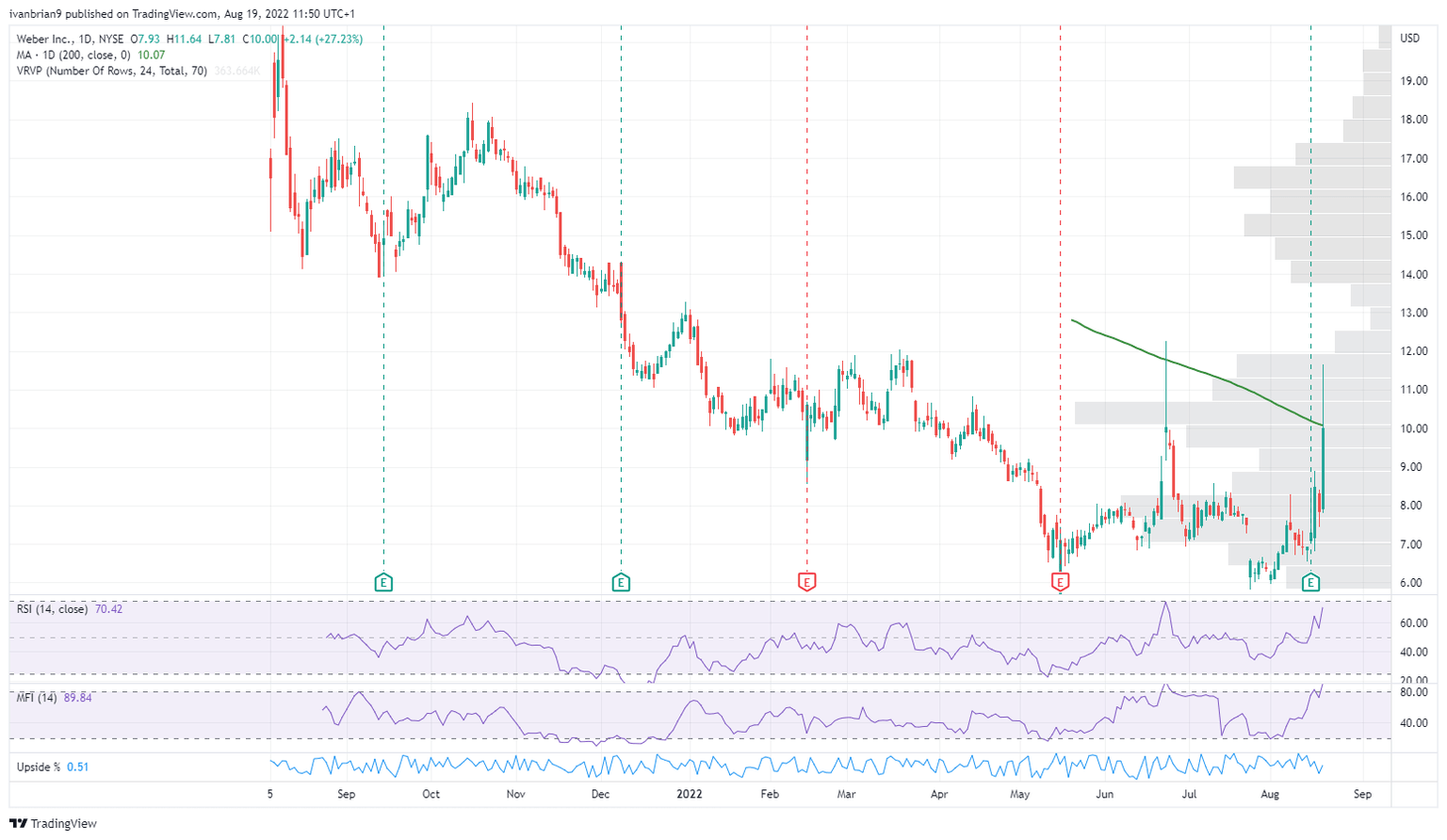 First, let us go back in time but not too far. Earnings were posted on August 15, and EPS missed while revenue was slightly ahead of forecasts. Despite revenue being ahead, it still declined by about 20% YoY, and the margin collapsed. Gross margin nearly halved on the back of foreign currency charges, supply chains and inflationary problems. Immediately after the earnings, Weber's management outlined plans to cut costs and suspend the dividend payment. Despite this, the stock began to trade notably higher and closed up 16% on Tuesday. Wednesday was a new day, and the fire appeared to be going out (stop me, editor, please!) as Citi downgraded WEBR. It closed 7% lower. As retail traders bailed out of BBBY, some appeared to turn their attention to WEBR stock. It trended on social media and closed Thursday up 27% but at one point was trading 40% higher on Thursday.