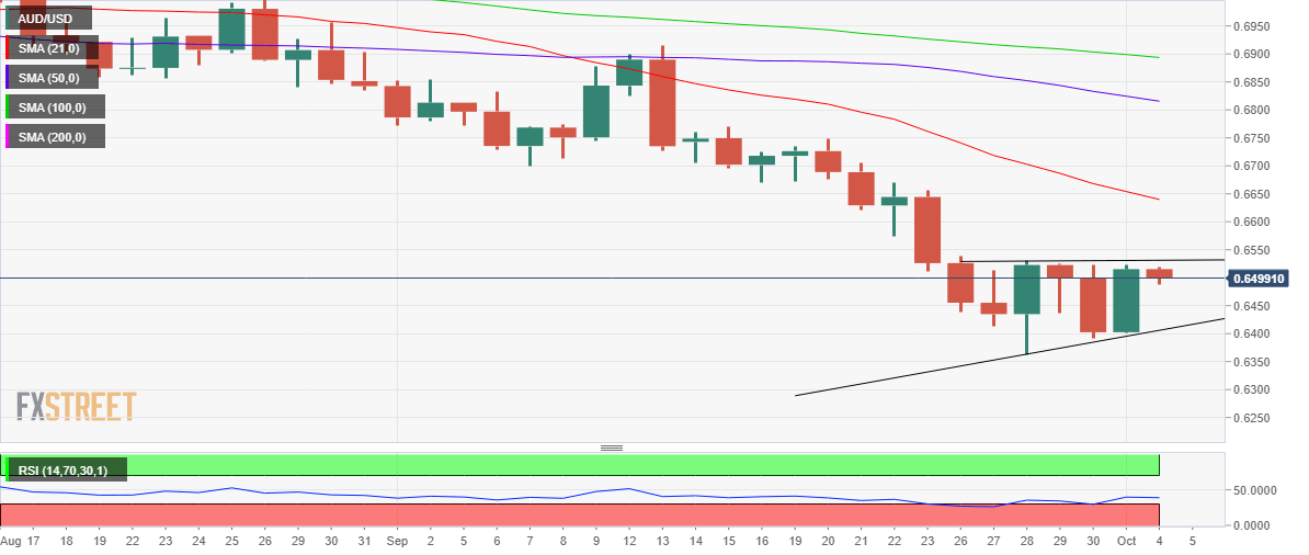 On the upside, a sustained move above the 0.6530 range highs is needed to yield a pennant breakout, opening doors for a fresh rally towards 0.6600. The bearish 21-Daily Moving Average (DMA) at 0.6639 will be the next resistance line on the upside break.