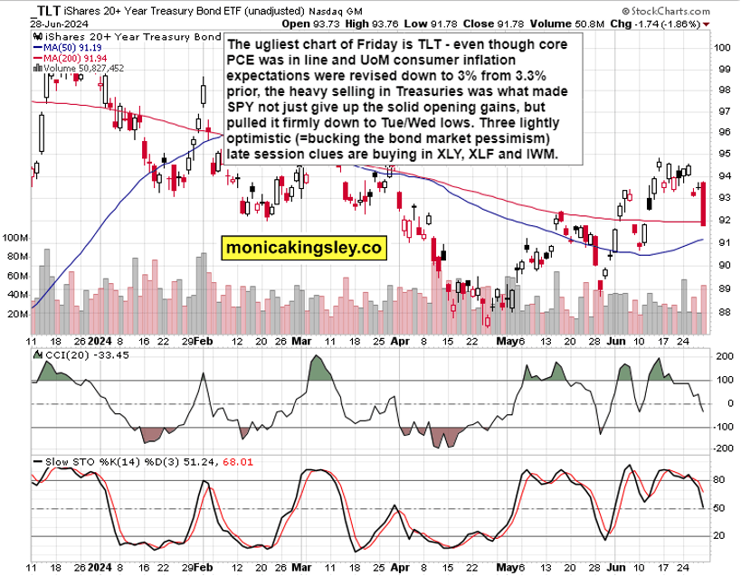 S&P 500 ran well into the data release, surged only to reverse in a four-hours selling streak. Some sectoral culprit? No, long-dated bonds did it – TLT daily slide did it. Was it fundamentally justified? Usually, you would see USD go up in tandem, but that didn‘t happen. The selling looks to me to be a combination of exhaustion to the upside (nicely illustrated with MACD divergence) and renewed rotation out of semiconductors after NVDA did its best to catch up to the upside around the data release.