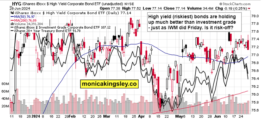 Were the PCE data disinflationary? That‘s still been very much the case – but have earnings become that much less attractive compared to yields over the day? For all the question marks still out there, I would argue that higher lows are still there in equities, and that first we see rotations and then broadening out as IWM seems to hint at regarding true(r) rate cut expectation, weeks to months ahead.
