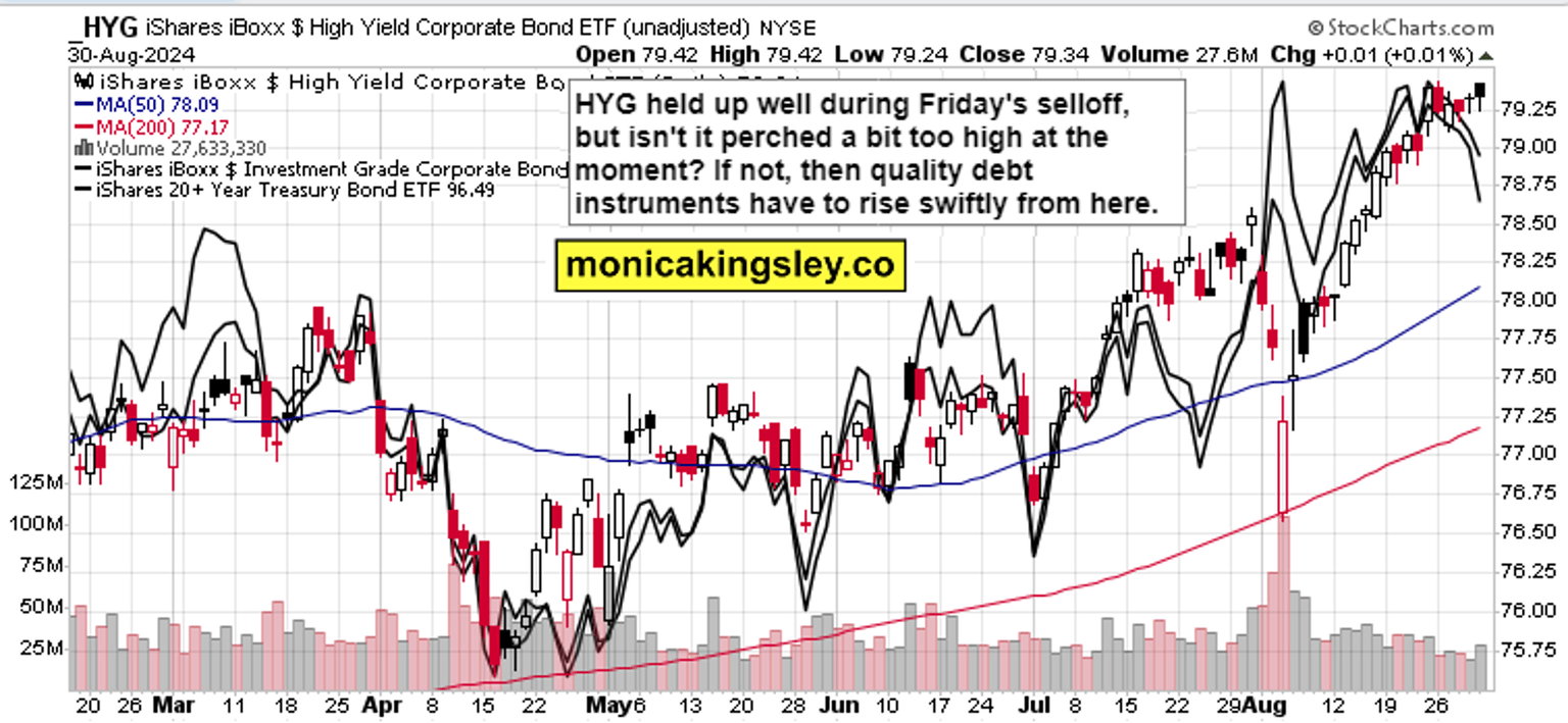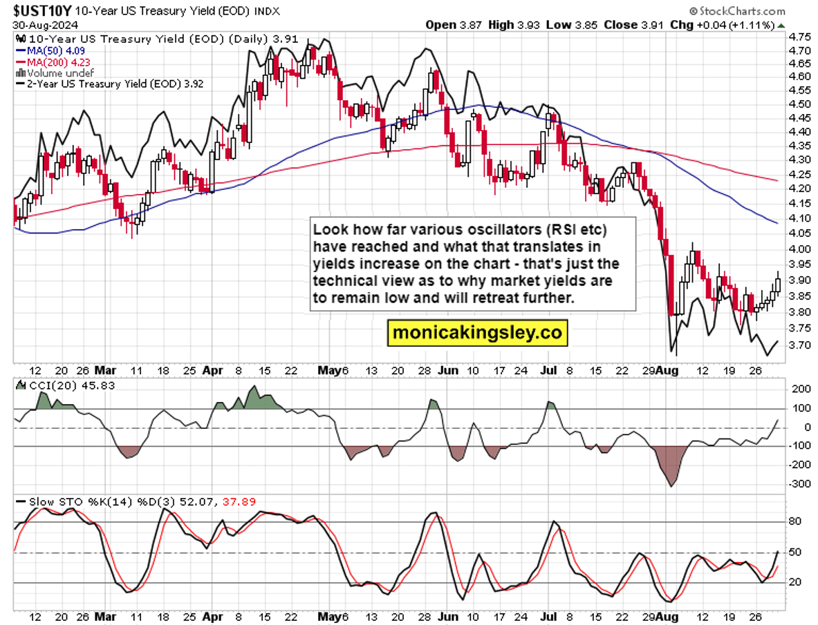 Tired rise in the dollar and yields represents an underappreciated risk – risk of a recession to the soft landing consensus – as the Fed‘s focus is to turn from inflation to the weakening job market. There was the Jackson Hole victory lap, disinflation continues, and also Friday‘s UoM inflation expectations were revised lower to only 2.8%.