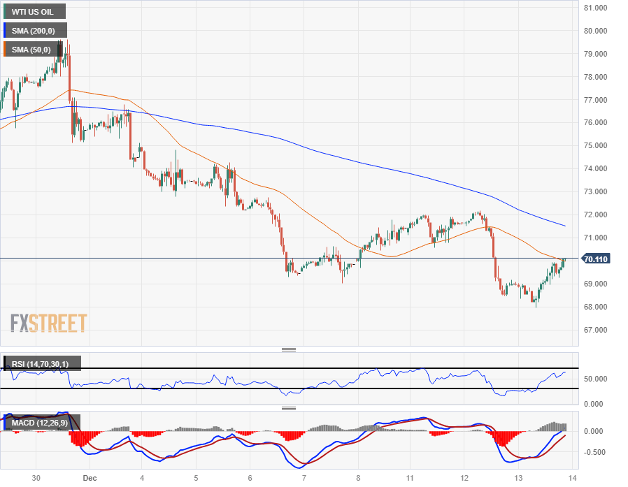 WTI’s Wednesday rebound sees WTI clambering back into $70, but US Crude Oil remains deeply in the cut, trading on the south side of the 200-hour Simple Moving Average (SMA) near $71.50. WTI hasn’t come within touch range of the 200-hour SMA since intraday bids dropped away from the moving average at the beginning of December when barrel prices dropped from $76.50.