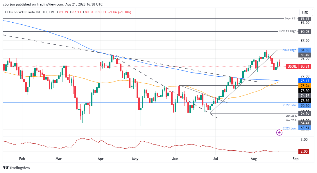 Western Texas Intermediate (WTI), the US crude oil benchmark, posted losses of 0.95% on Monday as China’s economic woes weighed on oil prices. Uncertainty from the US Federal Reserve (Fed) direction on rates favors the greenback, a headwind for US Dollar (USD) denominated assets. WTI is trading at $80.58, down 0.95%.