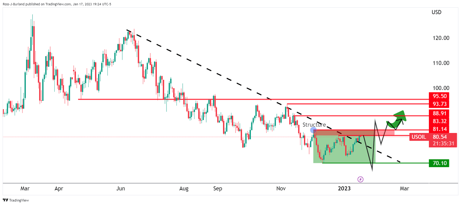 As per the prior analysis, WTI Price Analysis: Bulls press against daily trendline resistance, bears are lurking, the resistance in the $80s is of key importance for the foreseeable future. The following illustrates recent developments that resulted in a break of the bear cycle's daily trendline and prospects of a phase of accumulation that could result in a significant bullish correction going forward.