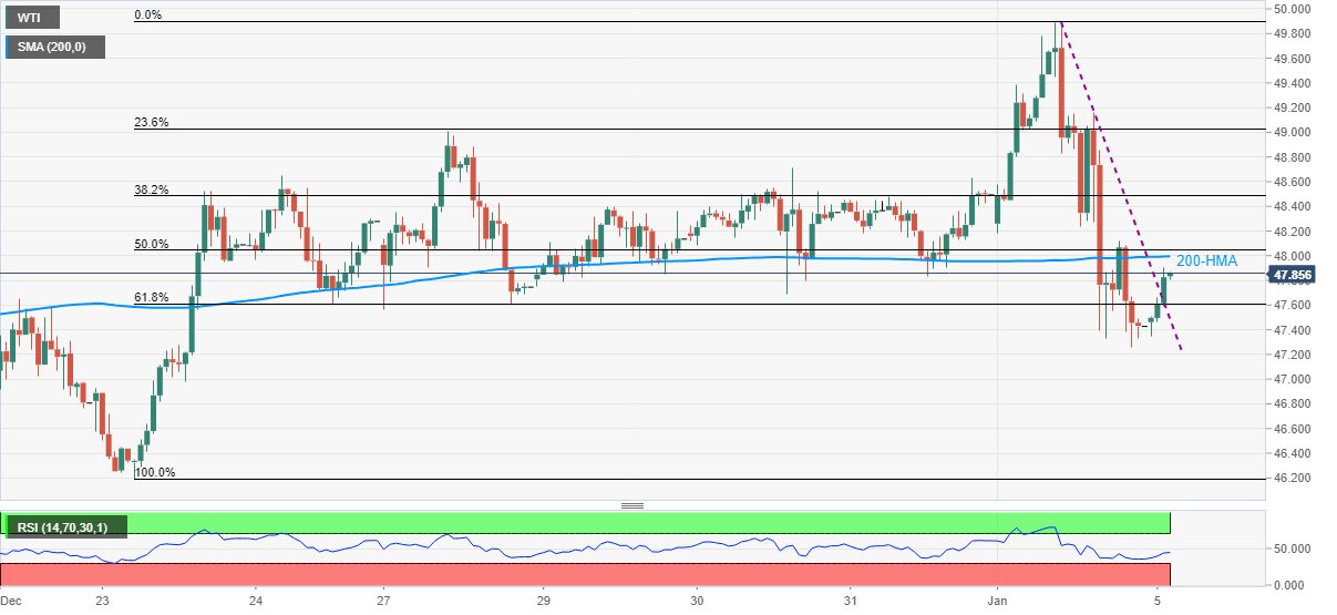 WTI recovers Monday’s losses while picking up the bids around $47.85, up 0.86% intraday, during Tuesday’s Asian session. In doing so, the oil benchmark bounces back beyond the 61.8% Fibonacci retracement of December 23 to January 04 upside while also breaking a downward sloping trend line from the previous day.