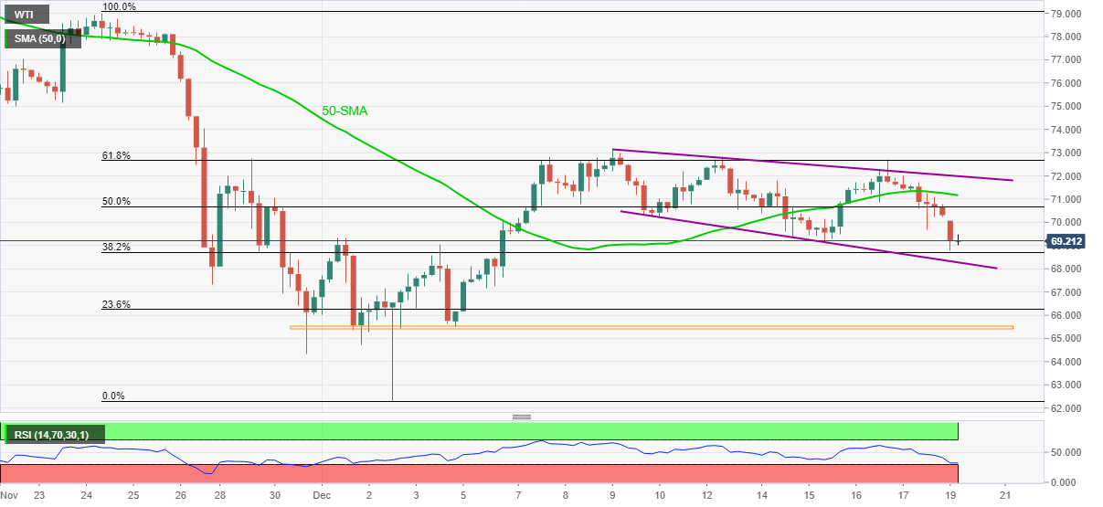 WTI crude oil traders lick their wounds near $69.20, down 1.55% intraday after refreshing the two-week low during early Monday.