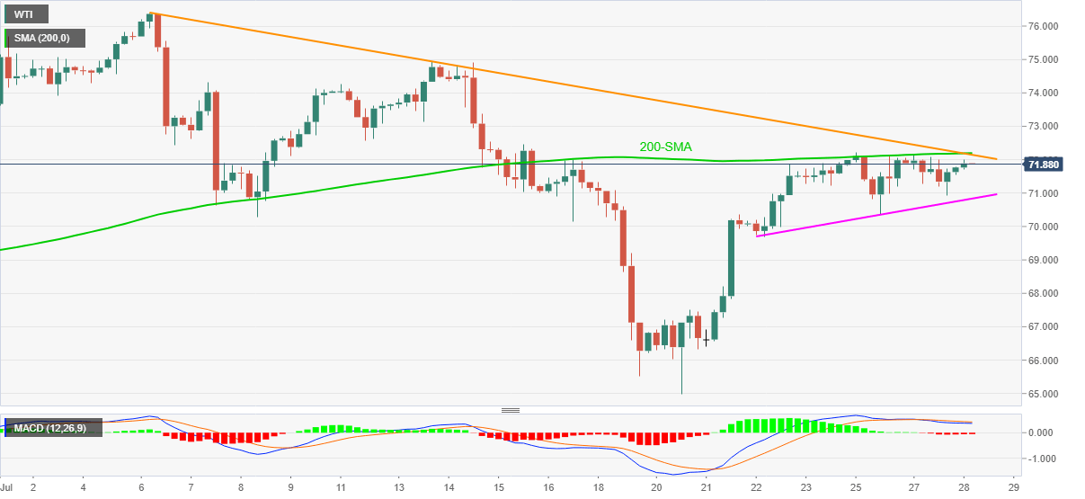 With the sluggish MACD conditions, bearish of late, the recent tops surrounding $72.20, also including 200-SMA and a downward sloping trend line from July 06, will keep testing the oil bulls.