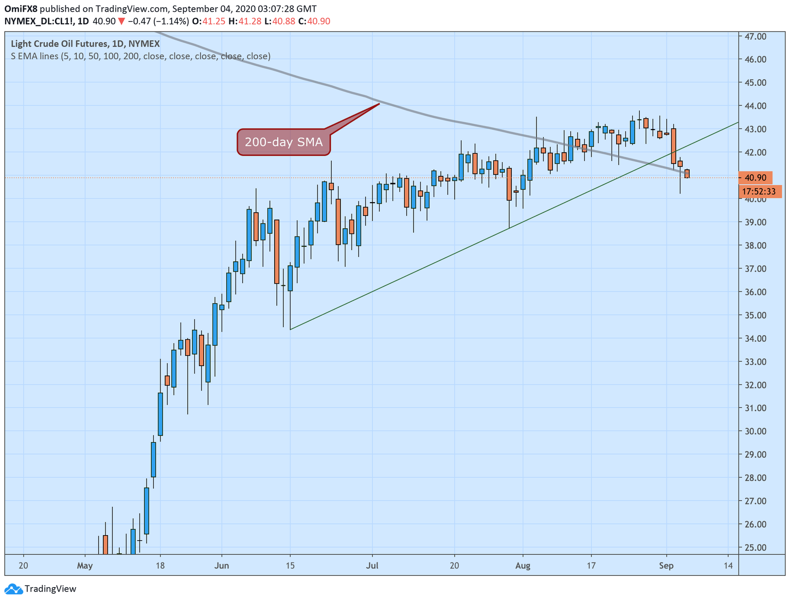 - WTI flips the 200-day SMA into support after rejection at $41.28.