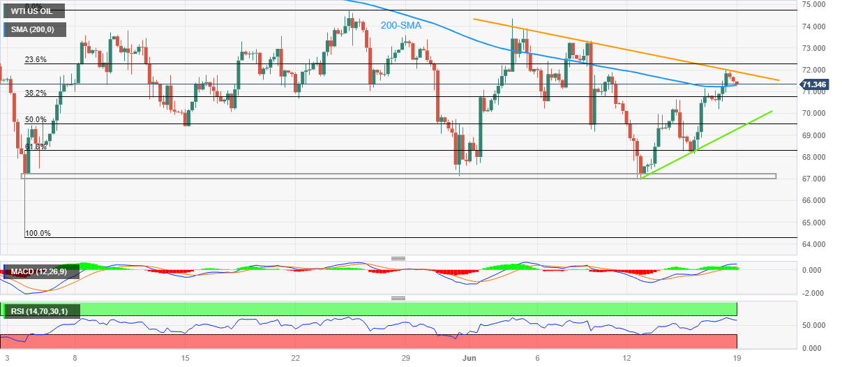 In doing so, the black gold reverses from a two-week-old descending resistance line amid nearly overbought RSI (14). However, the bullish MACD signals and the 200-SMA, around $71.30 by the press time, challenge the Oil bears.