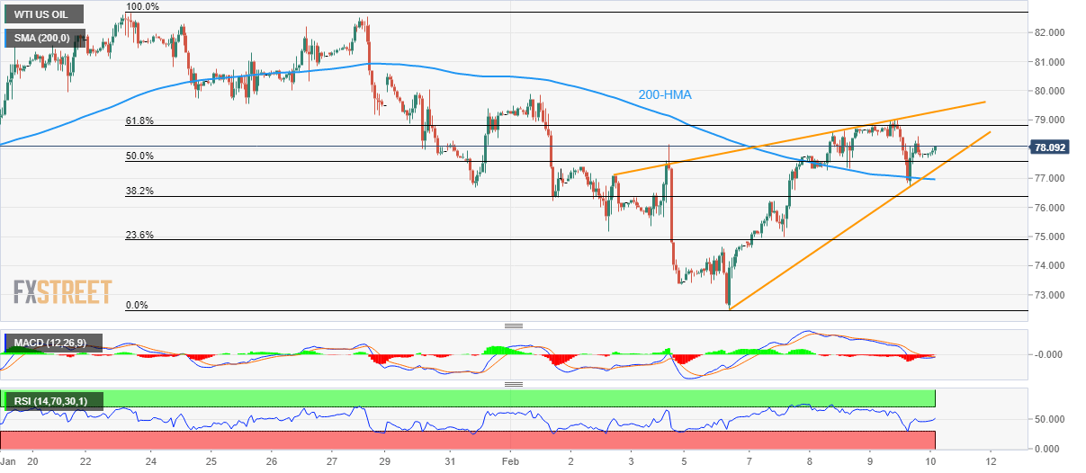 Even so, a one-week-old rising wedge bearish chart formation, currently between $77.30 and $79.30, keeps the Oil sellers hopeful, especially after the previous day’s retreat from the 61.8% Fibonacci retracement level of the quote’s downturn from January 23 to February 03.