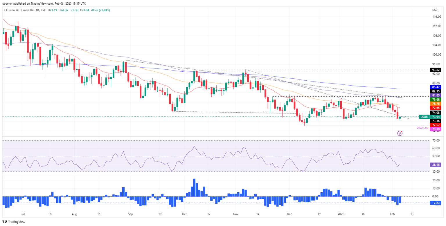 Technically, WTI is still downward biased as long as the quote stands below $82.00 PB. Additionally, last Friday’s WTI failure to crack the 20-day Exponential Moving Average (EMA) at $77.65 exacerbated oil’s fall toward the year’s lows, at $72.30, breaking below the January 4 low of $72.50.