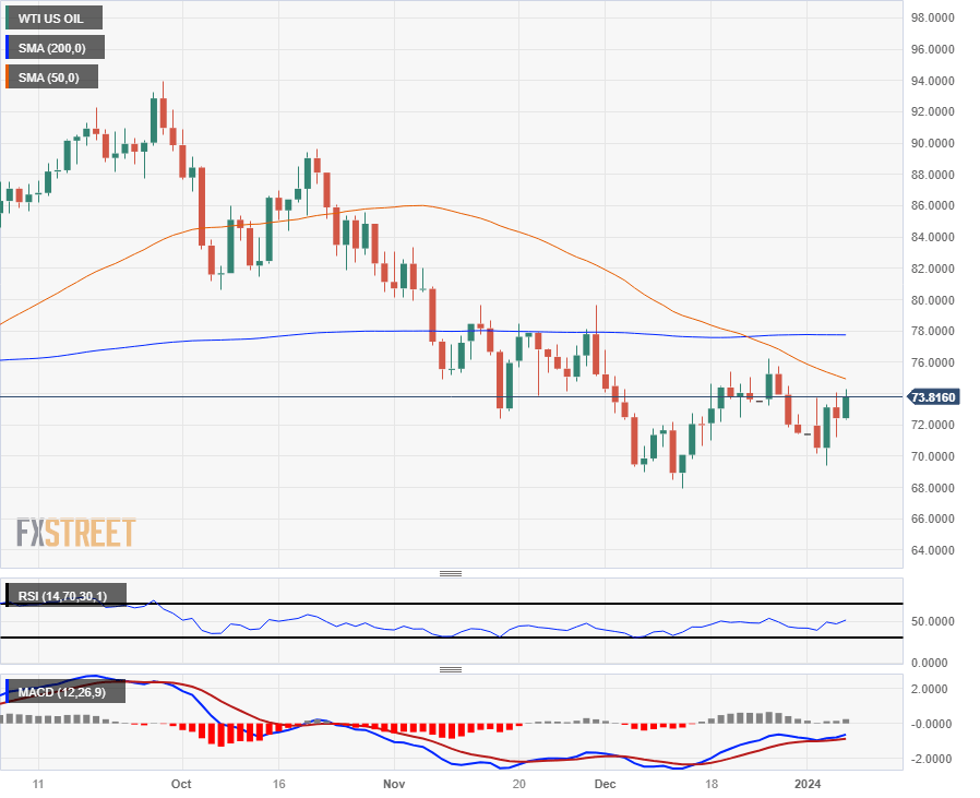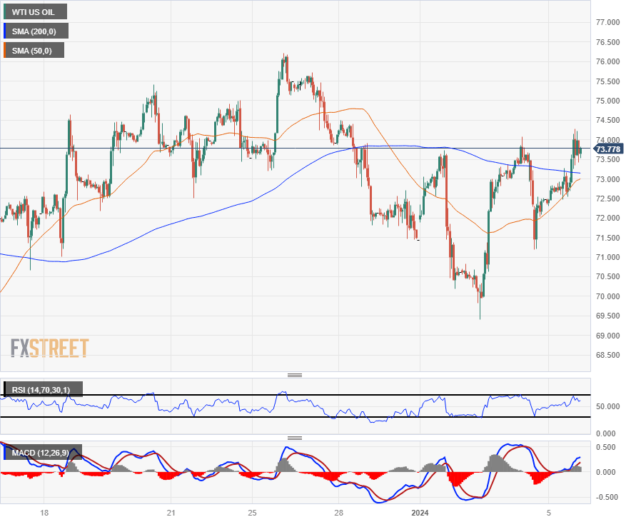 West Texas Intermediate (WTI) US Crude Oil rose again on Friday, tapping 74.27 as Middle East tensions continue to weigh on energy markets.