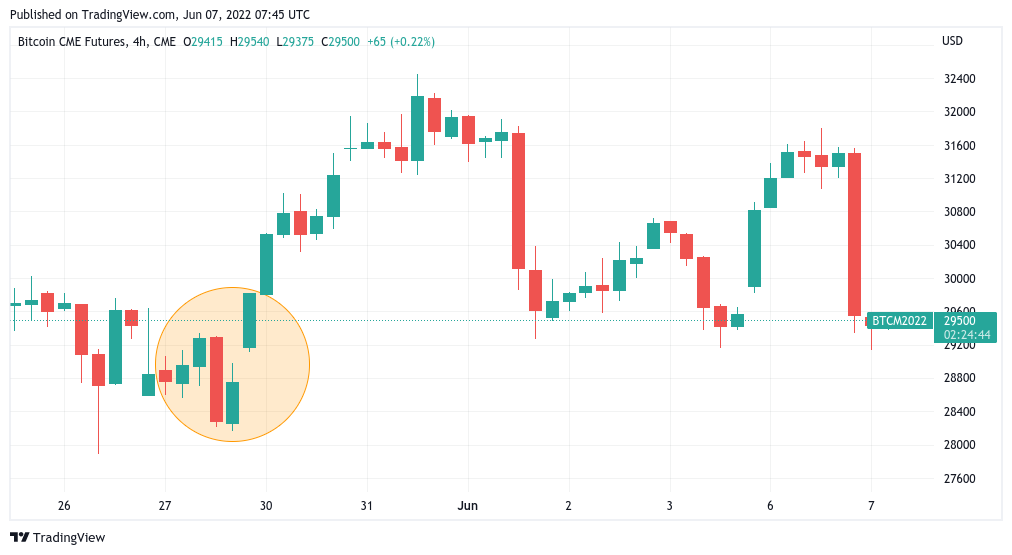 CME Bitcoin futures 4-hour candle chart with unfilled gap highlighted. Source: TradingView