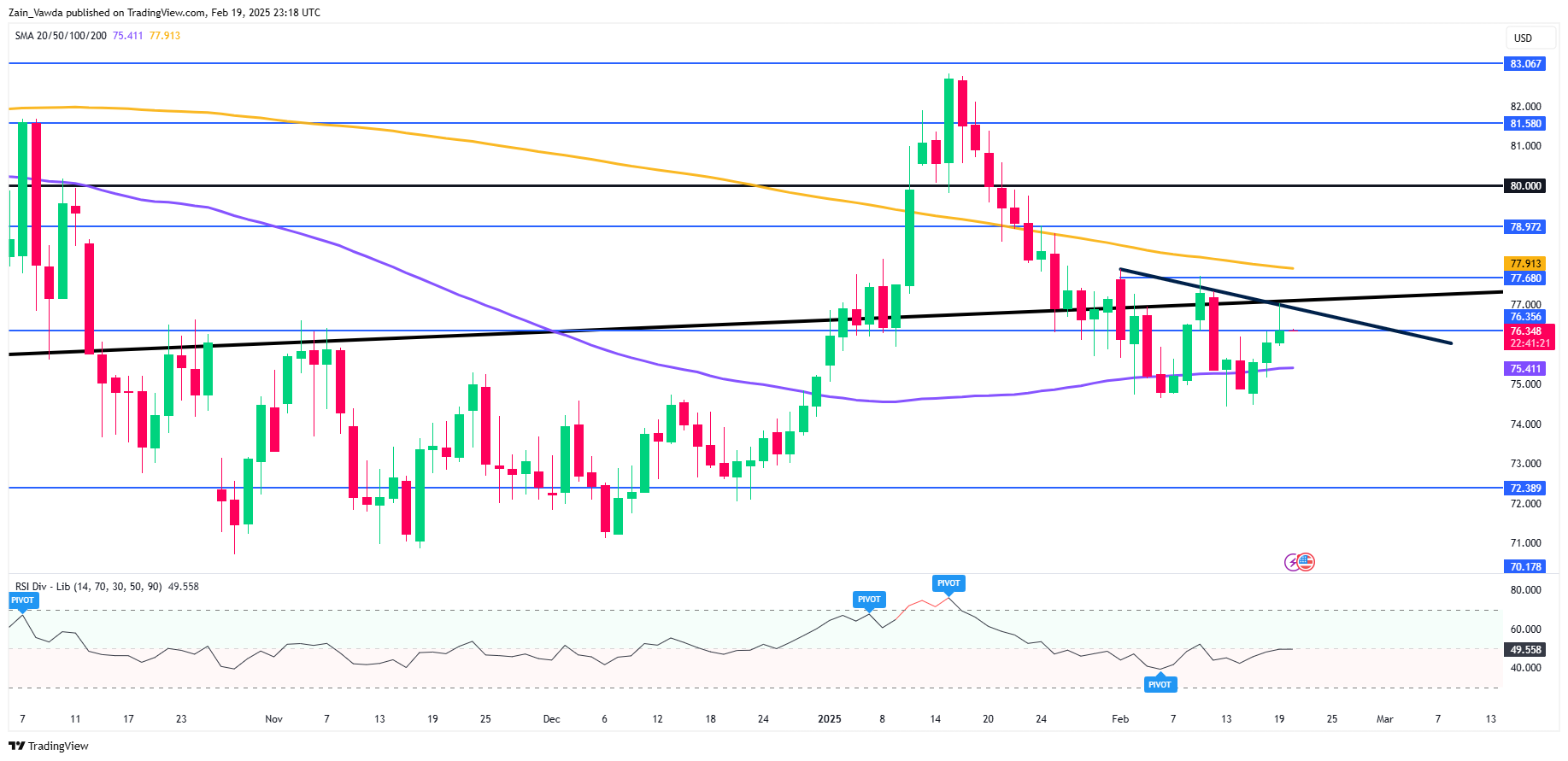 Lower down, Support may be found at the swing low around 74.43 before the 72.39 handle comes into focus.