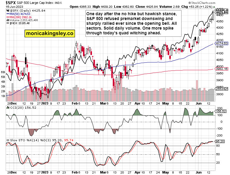 |S&P 500 sharply recovered from yesterday‘s shallow premarket decline, and surged on ever strengthening sectoral composition. Tech didn‘t lag, and it was the case of remaining sectors playing catch up, and playing it well. My ES 4,440 zone gave, and even the 4,480 resistance was breached.