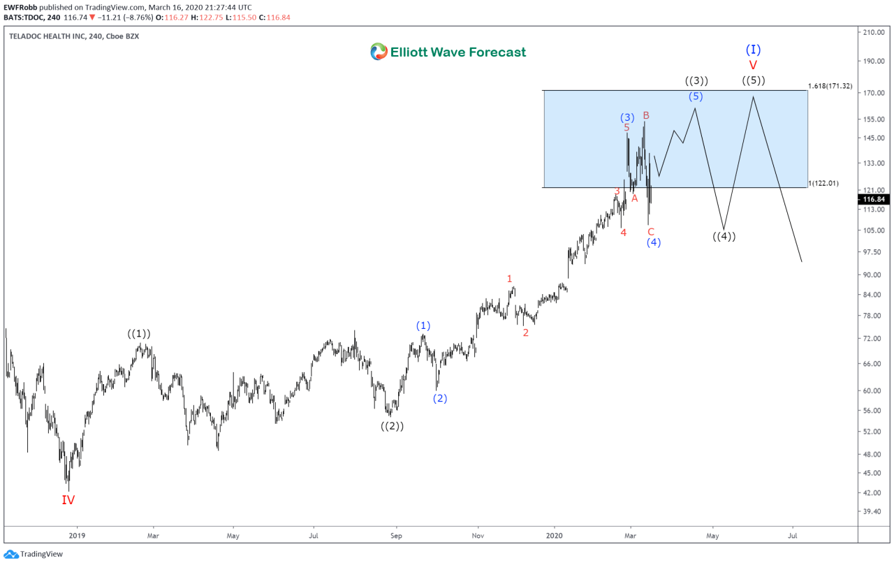The Elliott Wave count since the all time lows set in 2016 paint a bullish picture. Teladoc Health bottomed on March 28/2016 at an all time low of $9.08. From there a Red I is set at $19.49 on the 19th of September 2016. A Red II then followed on October 14/2016 at $14.00. From there a Red III top materialized at $89.05 on October 1/2018. A Red IV then bottomed on December 24/18 at $42.08. Presently $TDOC is rallying in a Red V and has reached the equal legs area of Red III-Red IV. This area is where a Red V Can materialize for a longer term top. The more in depth 4H count suggests further upside is needed to complete the bullish sequence.