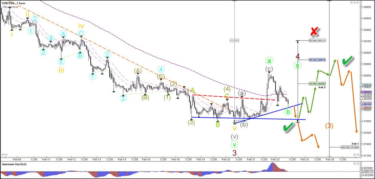 The EUR/USD could be building an ABC (green) flat correction within wave 4 (dark red). A bearish breakout or bounce (green check) could confirm the downtrend continuation. A break above the 50% Fib makes the wave 4 less likely (red x).