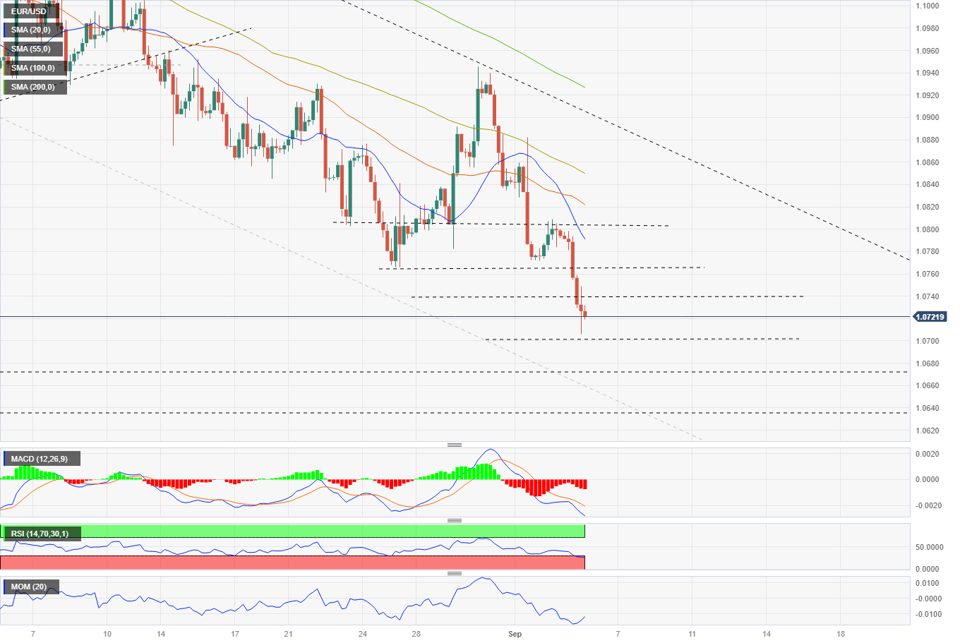 - The EUR/USD falls to its lowest level in almost three months, with losses limited above 1.0700.