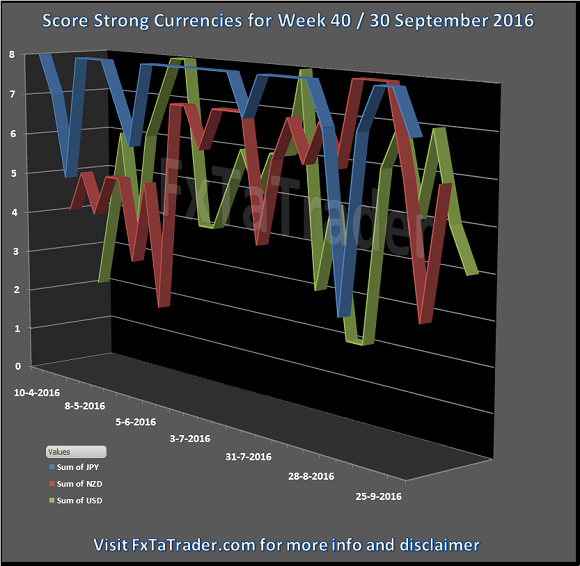 The JPY is clearly the strongest currency and the NZD had a 1 bad week but recovered. Here below you can see the Weekly Currency Score Chart with 6 months data as a reference.