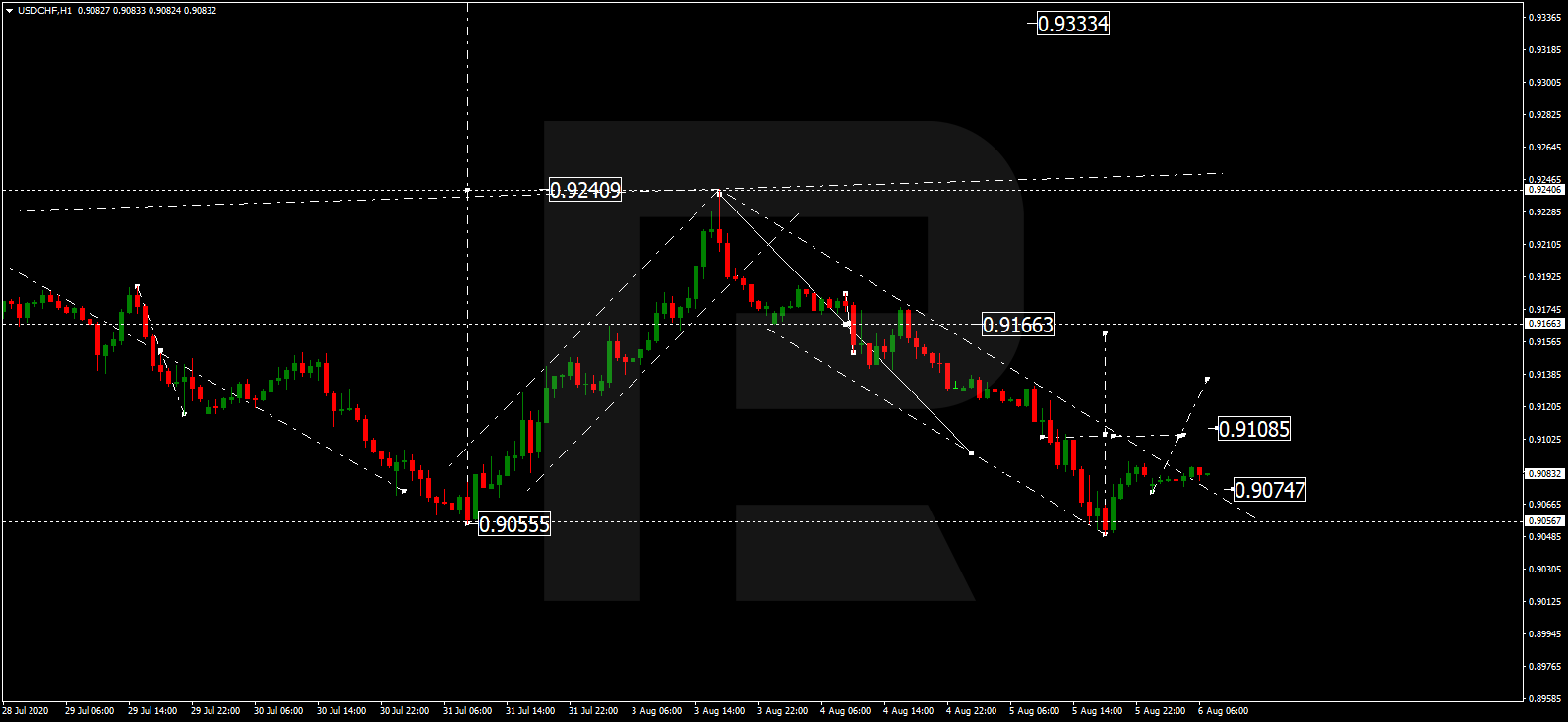 After finishing the descending structure at 0.9050, USDCHF is moving upwards to break 0.9080 and may later reach 0.9166. After that, the instrument may start a new decline towards 0.9100. In fact, the market continues forming a wide consolidation range around 0.9166.