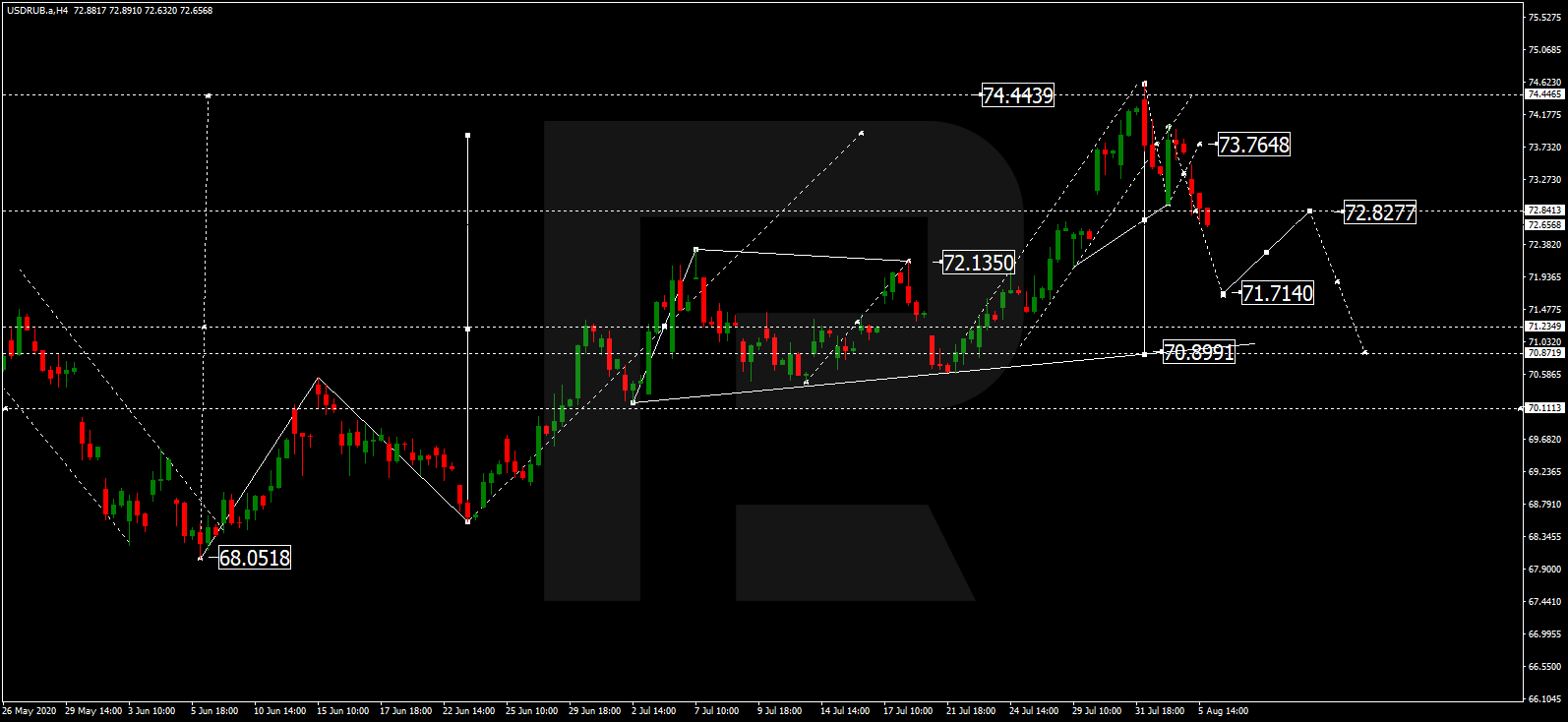 USD/RUB is moving to break 72.80 to the downside. Possibly, the pair may form a new descending structure with the short-term target at 71.71 and then start another correction to return to 72.80. After that, the instrument may resume trading downwards with the first target at 70.90.